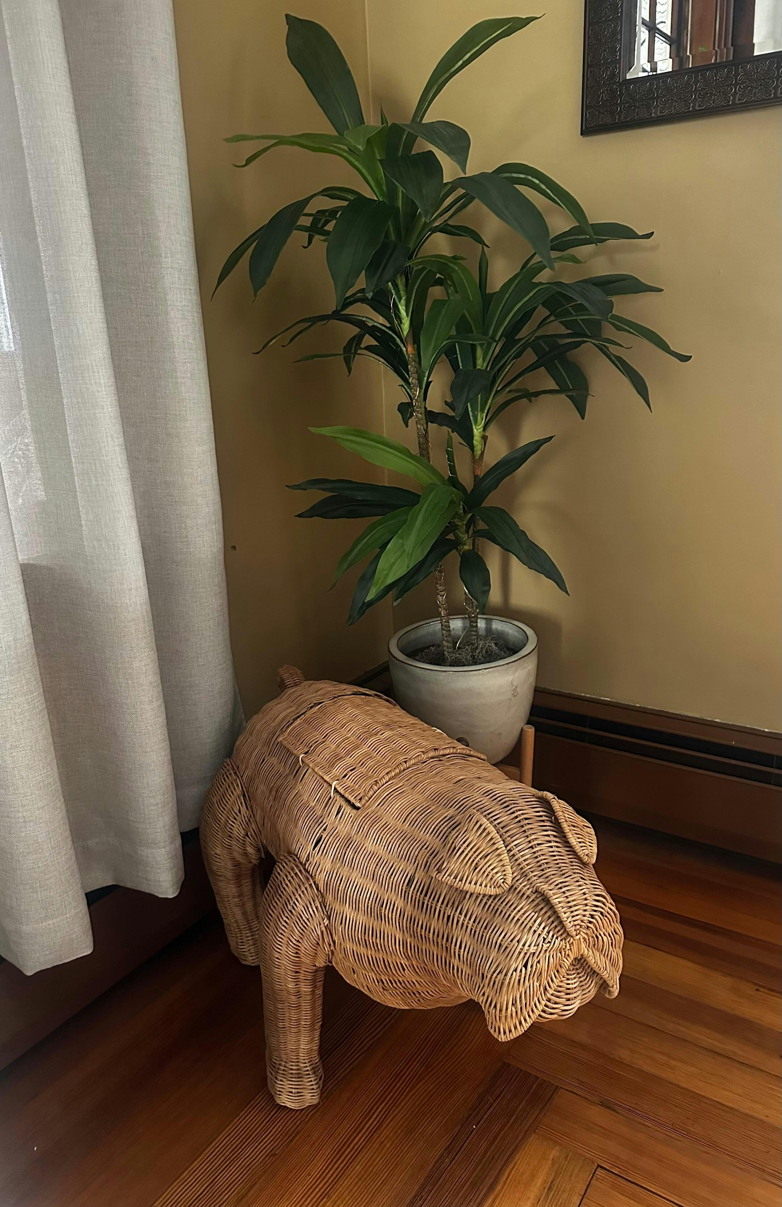 We have the wicker bulldog in our living room and it looks great! Such a well made, cool piece to add to the house thatβs fun yet fits perfectly into the decor. The construction is sturdy and there is ample space in it to store many different things (books, dog toys, photo albums, Knick knacks, etc).